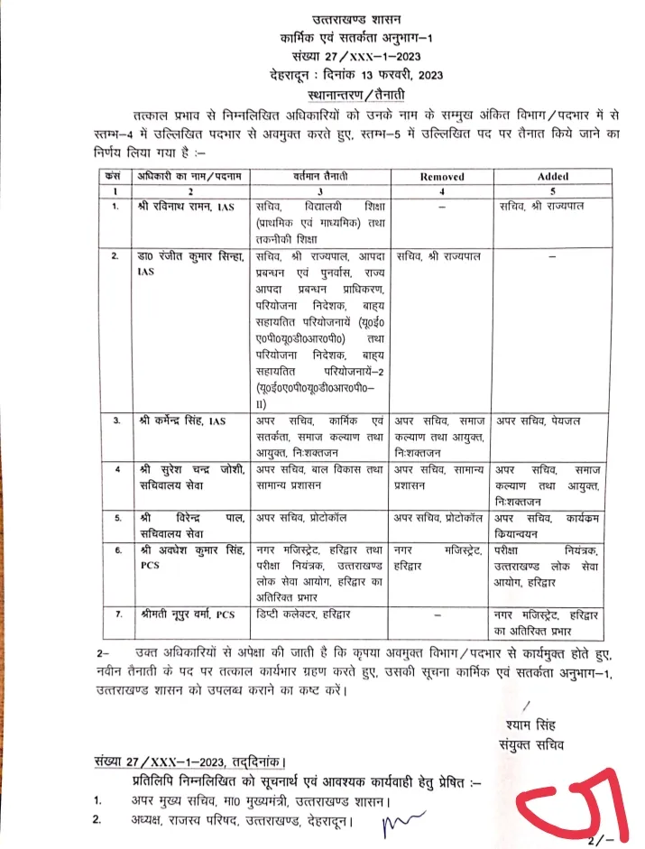 सचिवालय सेवा के सुरेश चन्द्र जोशी अपर सचिव, सामान्य प्रशासन को बदल कर अपर सचिव, सामान्य अपर सचिव, समाज कल्याण तथा आयुक्त, निःशक्तजन मिला है। विरेन्द्र पाल सचिवालय सेवा से अपर सचिव प्रोटोकॉल को बदल कर अपर सचिव कार्यक्रम किर्यान्यन की जिम्मेदारी दी गई है। पीसीएस अवधेश कुमार सिंह से नगर मजिस्ट्रेट से हटाकर नियंत्रक, उत्तराखण्ड लोक सेवा आयोग, हरिद्वार की जिम्मेदारी दी गई है। पीसीएस नूपुर वर्मा को डिप्टी कलेक्टर हरिद्वार के साथ नगर मजिस्ट्रेट, हरिद्वार का अतरिक्त प्रभार दिया गया है।
