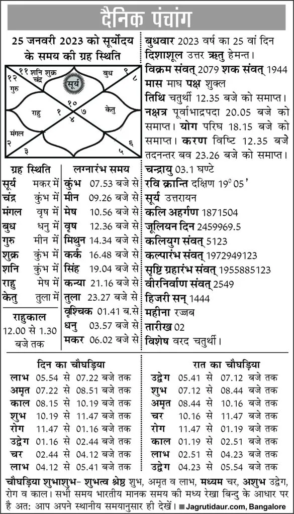 माघ शुक्ल पक्ष चतुर्थी, बुधवार, 25 जनवरी 2023 का दिन आपके लिए कैसा रहेगा। आज आपके जीवन में क्या-क्या परिवर्तन हो सकता है, आज आपके सितारे क्या कहते हैं, यह जानने के लिए पढ़ें आज का भविष्यफल।